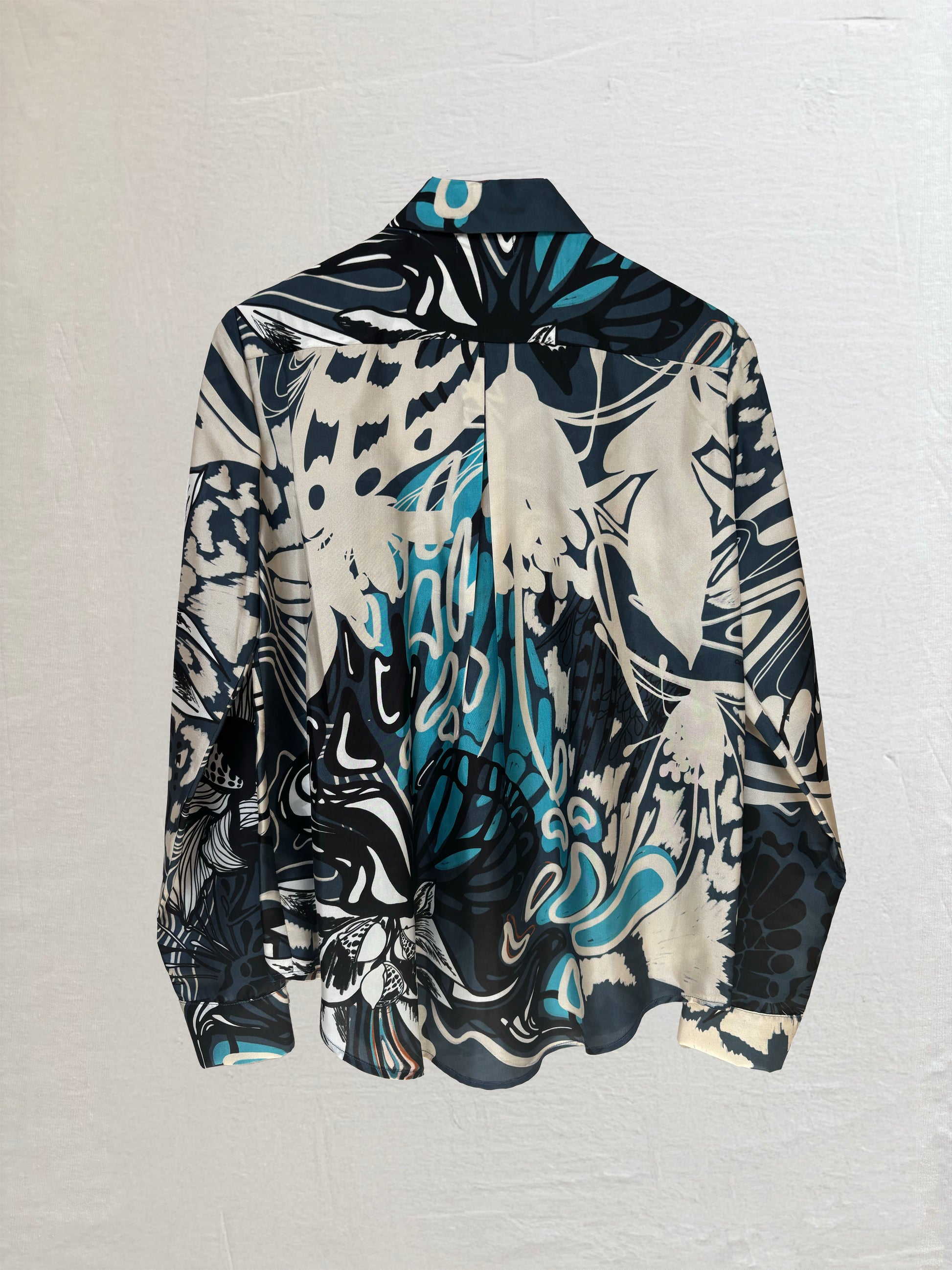 Camisa en pura seda natural con calce clásico y línea slim, liviana y suave al tacto. Su estampa exclusiva mezcla tonos de azul, negros, crudos y toques de aguamarina en un diseño artístico que transmite movimiento y energía.