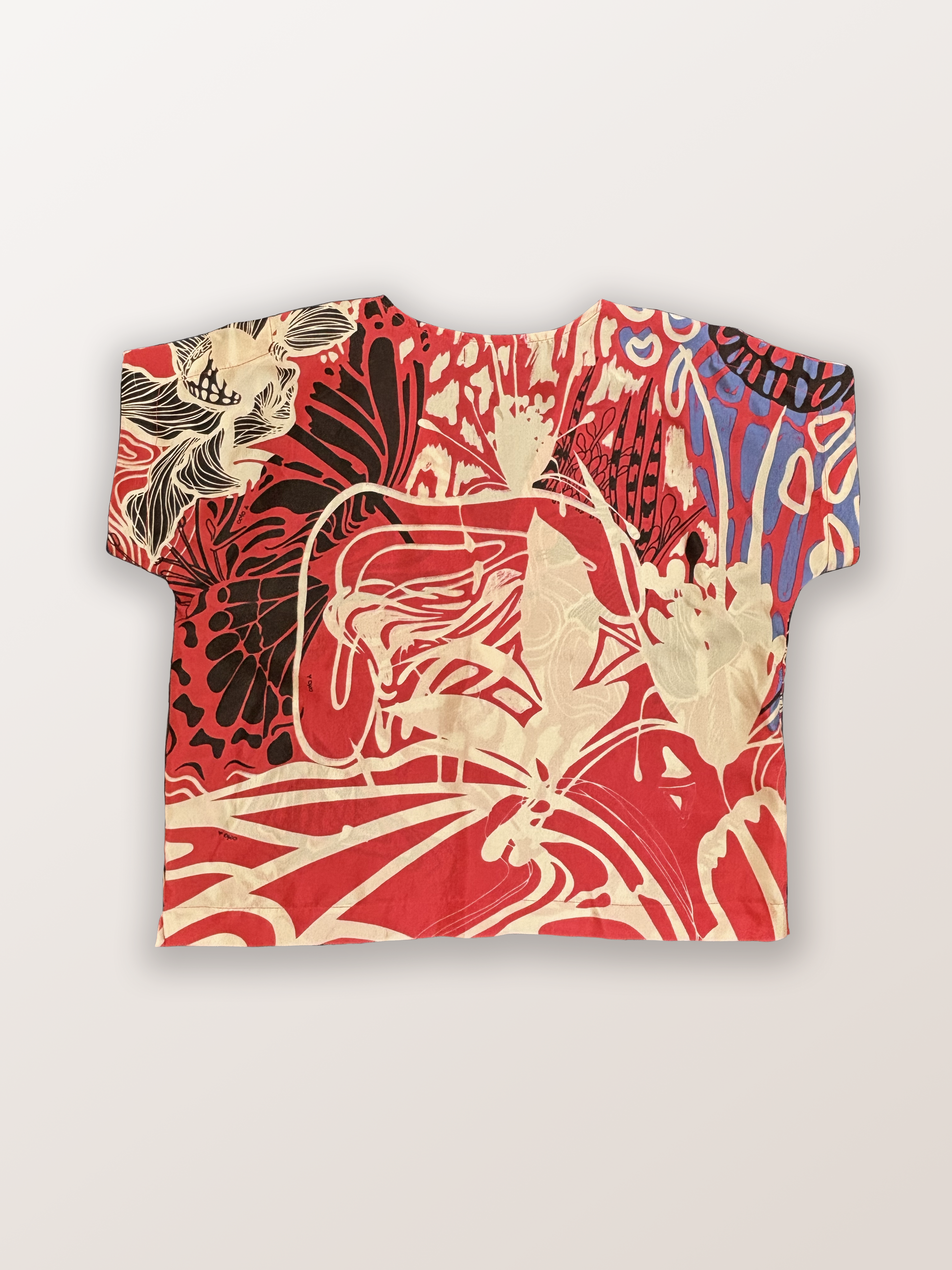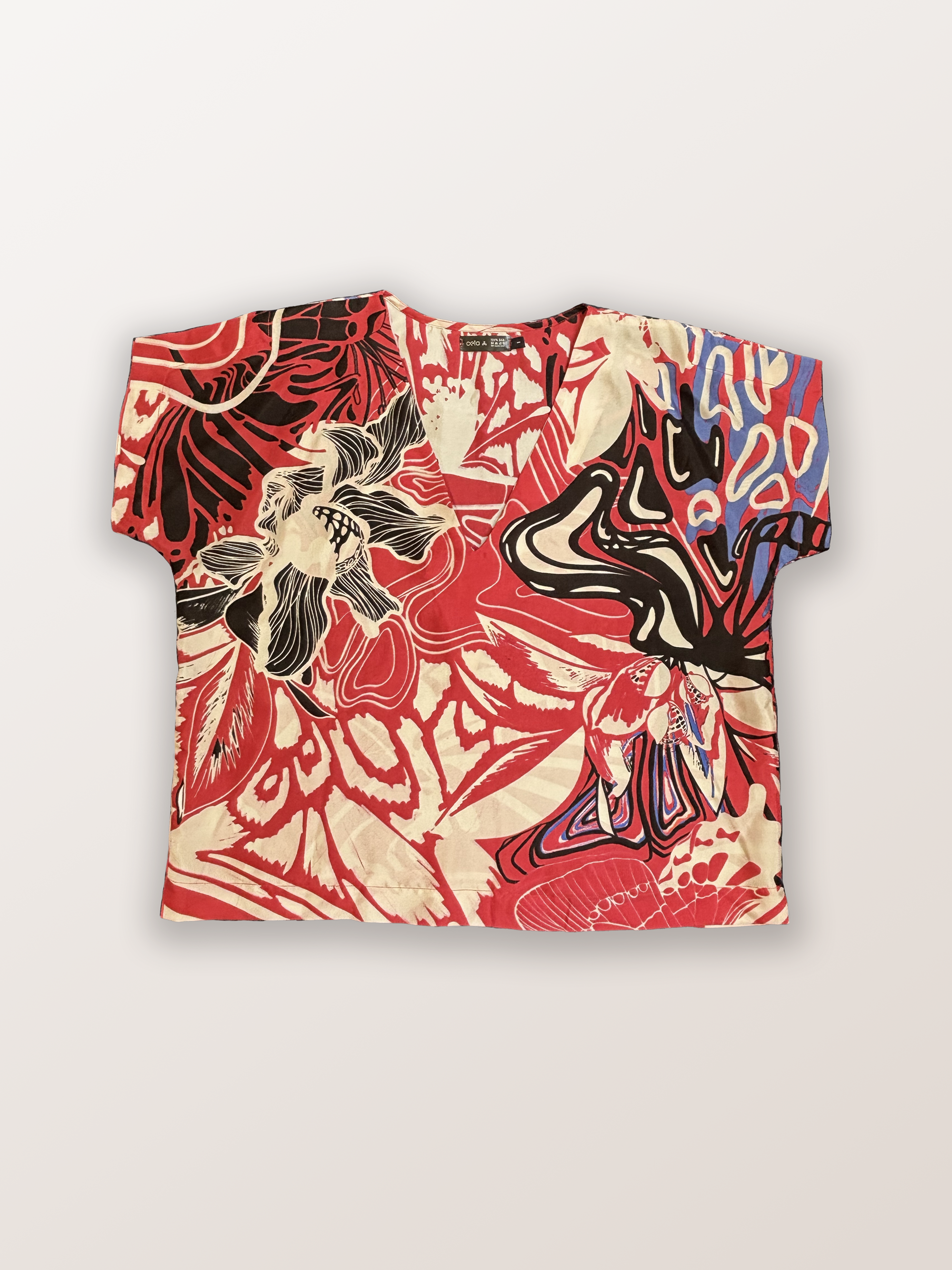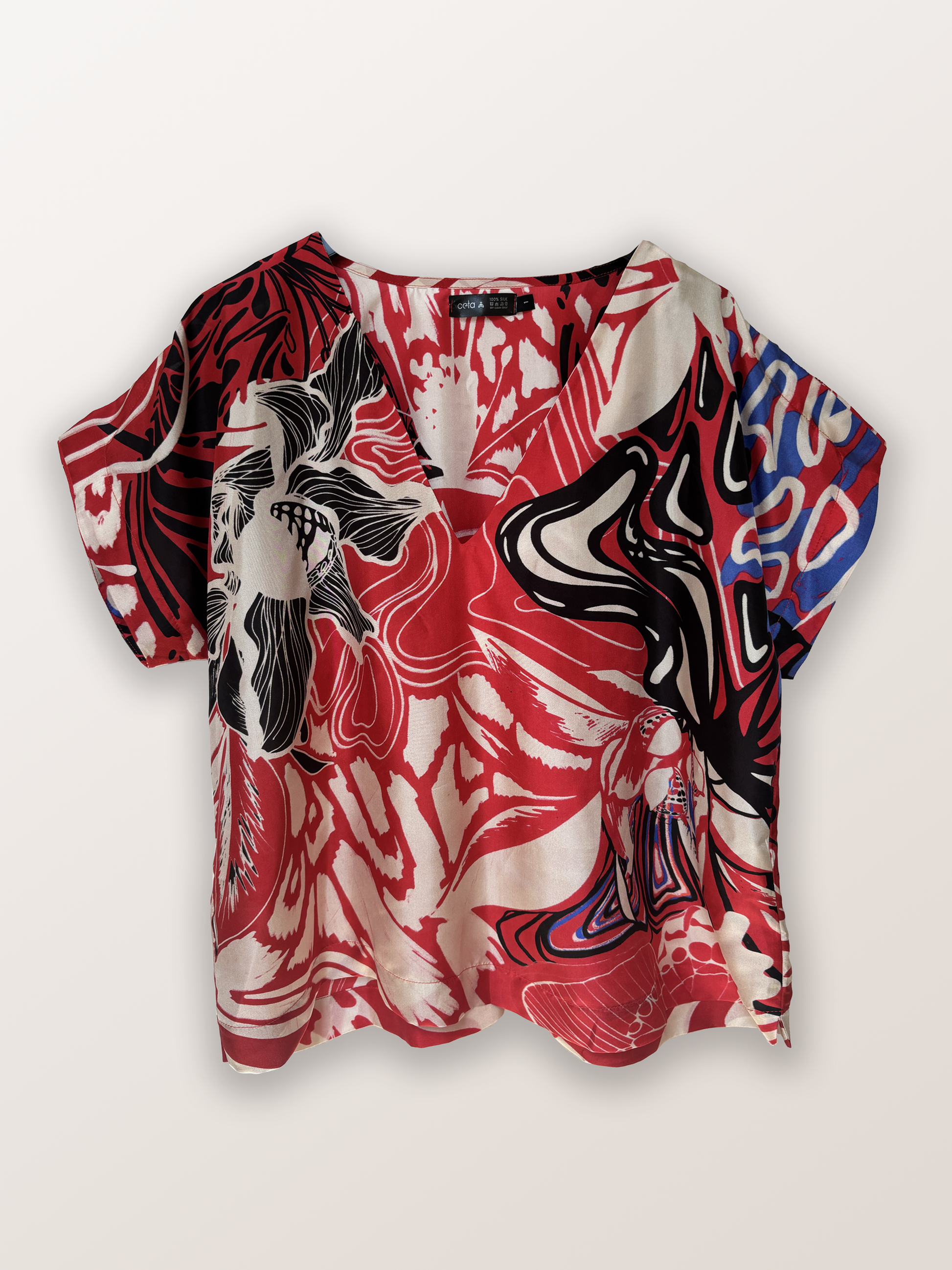 Su estampa exclusiva en tonos rojos, negros, crema y acentos azules crea un impacto visual vibrante y contemporáneo, ideal para realzar cualquier look tanto de día como de noche. El escote en V y las mangas cortas aportan frescura y un calce relajado que favorece distintas siluetas.