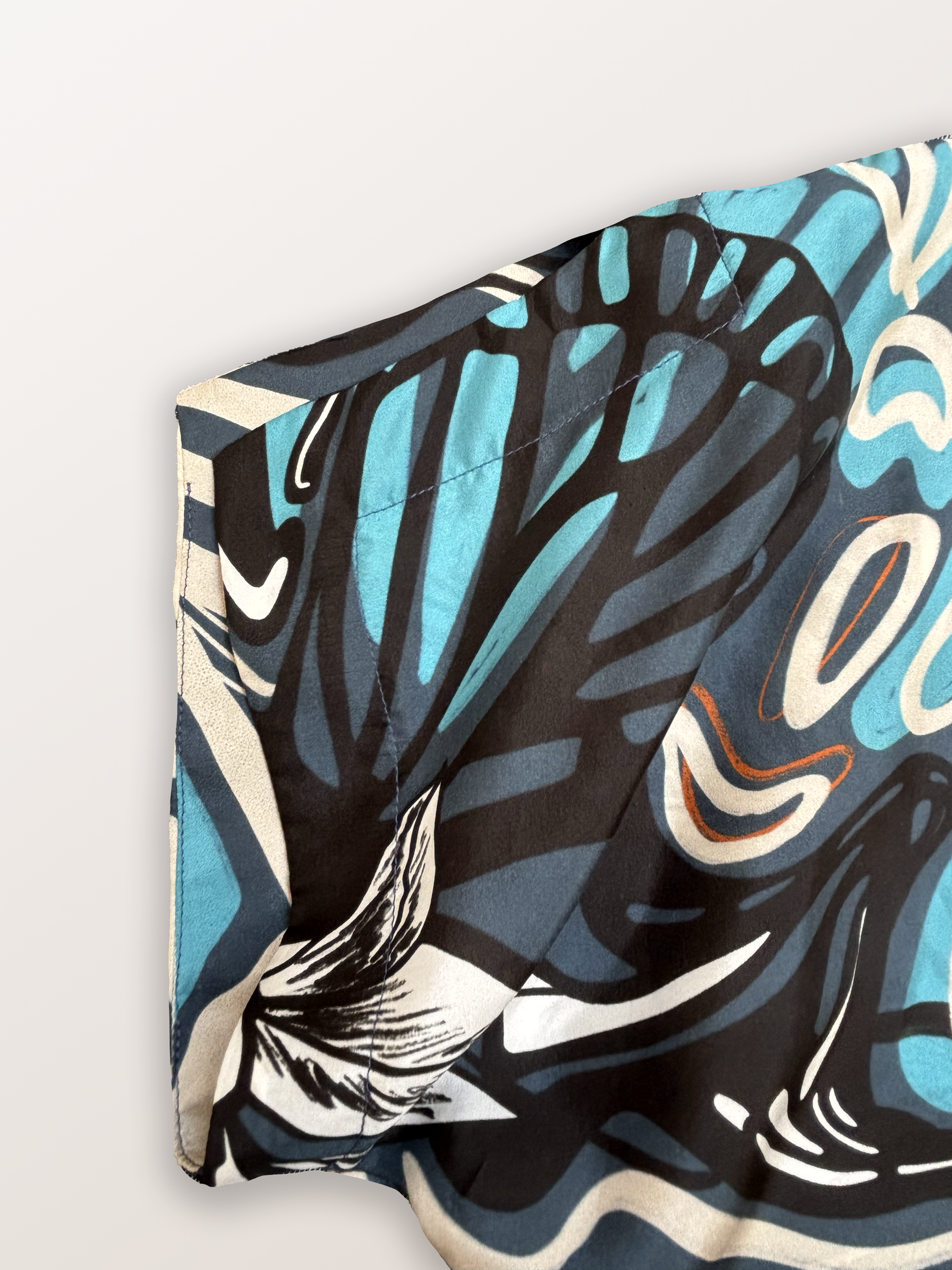 Su estampa exclusiva en tonos rojos, negros, crema y acentos azules crea un impacto visual vibrante y contemporáneo, ideal para realzar cualquier look tanto de día como de noche. El escote en V y las mangas cortas aportan frescura y un calce relajado que favorece distintas siluetas.